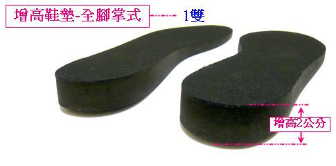 產品規格: 全腳掌鞋墊(後腳跟增高2公分厚) X 1雙,加上2公分厚增高墊 X 3雙 。